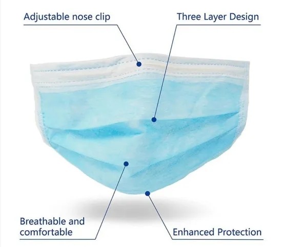 This type of disposable three-layer mask consists of two layers of non-woven fabrics and a piece of filter paper,capable of filtering out bacteria ,It has good air permeability, comfortable to wear,dust prevention and sterilization, Environment friendly and wholly plastic strip is adopted for the part over the bridge of the nose, so it can be adjusted at will to fit the line of your bridge of nose,without glass fibre,hypoallergenic.